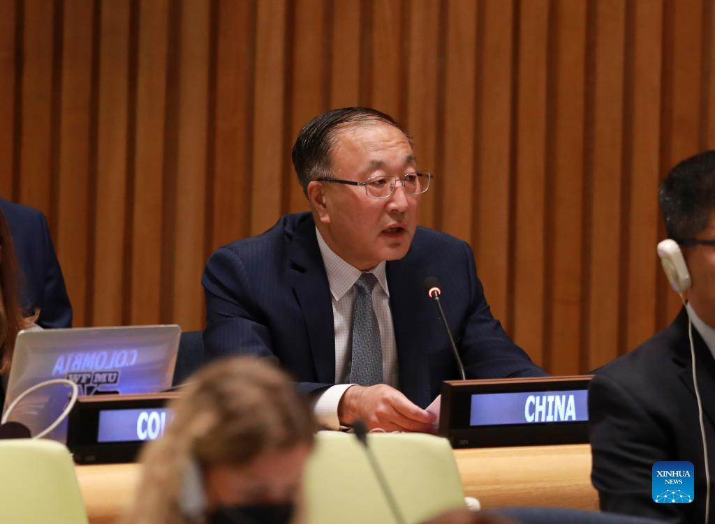 Zhang Jun, China's permanent representative to the United Nations, delivers the joint statement by the Group of Friends of the Global Development Initiative (GDI) at a General Assembly high-level special event entitled "Time to Act Together: Coordinating Policy Responses to the Global Food Crisis" at the UN headquarters in New York, July 18, 2022. (Xinhua/Xie E)