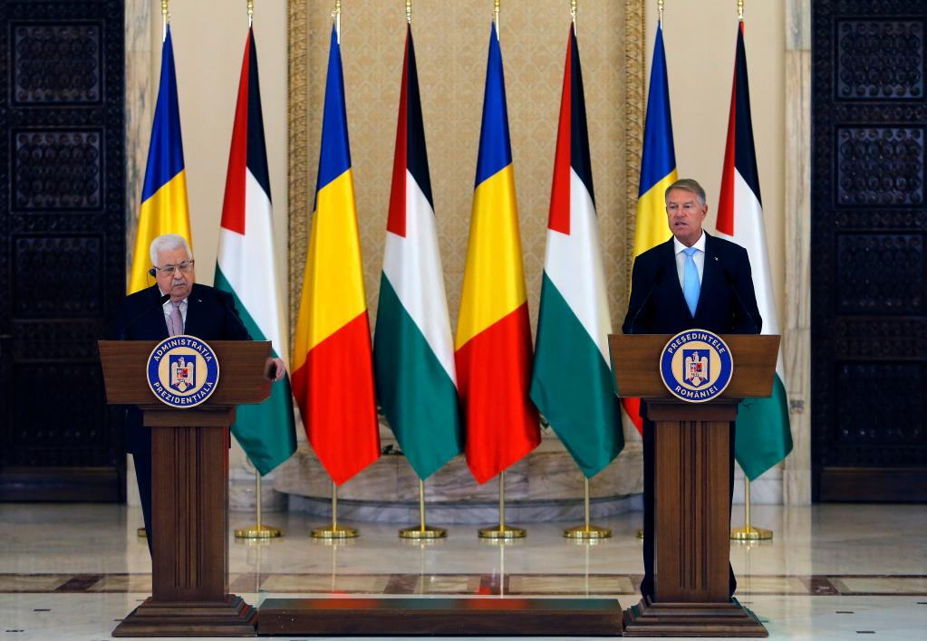 Palestinian President Mahmoud Abbas (L) and Romanian President Klaus Iohannis attend a news conference at Cotroceni Presidential Palace in Bucharest, capital of Romania, July 19, 2022. Visiting Palestinian President Mahmoud Abbas on Tuesday called on Israel to cease "unilateral action that undermines the two-state solution." (Photo by Cristian Cristel/Xinhua)