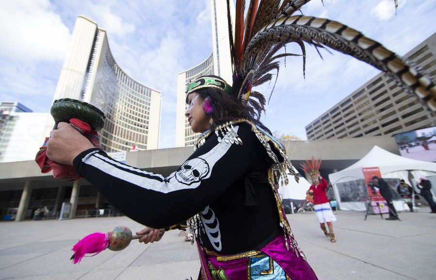 A dressed-up Indigenous performer dances during the 2021 Indigenous Legacy Gathering in Nathan Phillips Square in Toronto, Canada, on Nov. 4, 2021.(Photo by Zou Zheng/Xinhua)