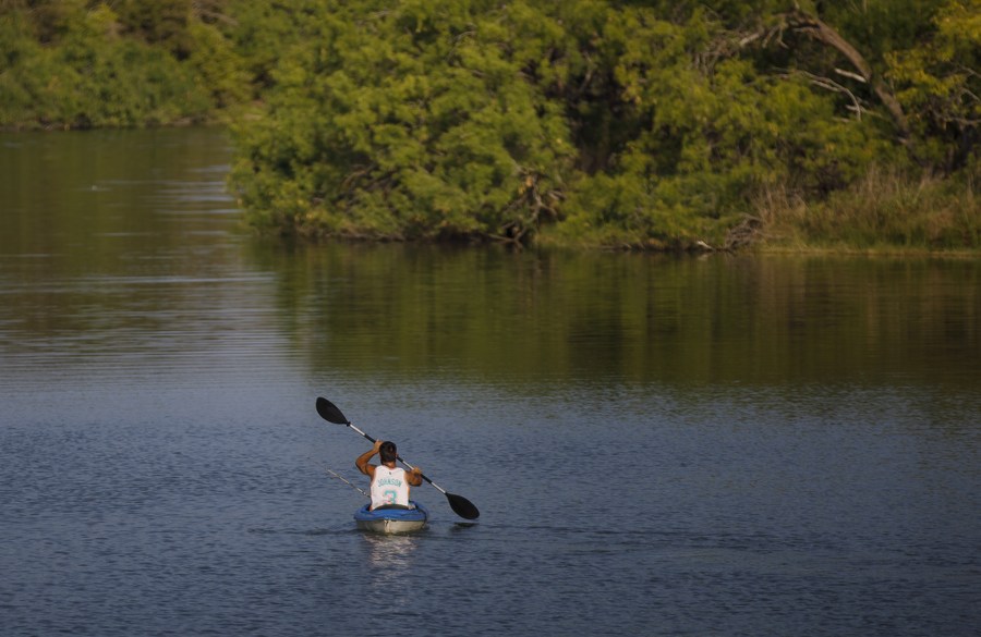 A man kayaks across Calaveras Lake in Bexar County, Texas, the United States, on July 18, 2022. (Photo by Nick Wagner/Xinhua)