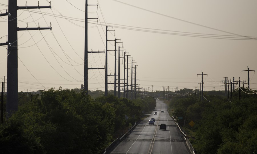 Vehicles run on a road next to power transmission lines in San Antonio, Texas, the United States, on July 18, 2022. (Photo by Nick Wagner/Xinhua)