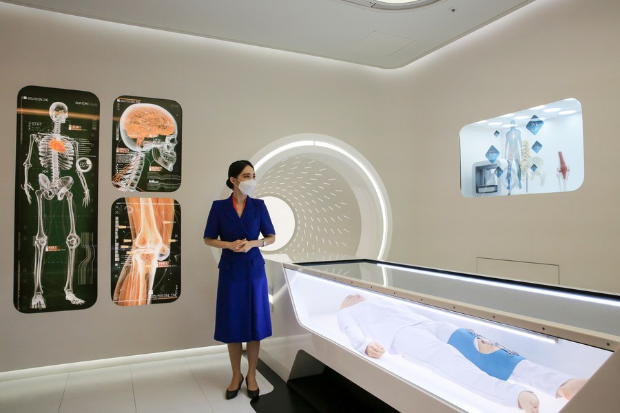 A guide explains an artificial intelligence doctor at the medical room aboard the "space shuttle" at T.um exhibition hall in Seoul, South Korea, July 19, 2022. (Xinhua/Wang Yiliang)