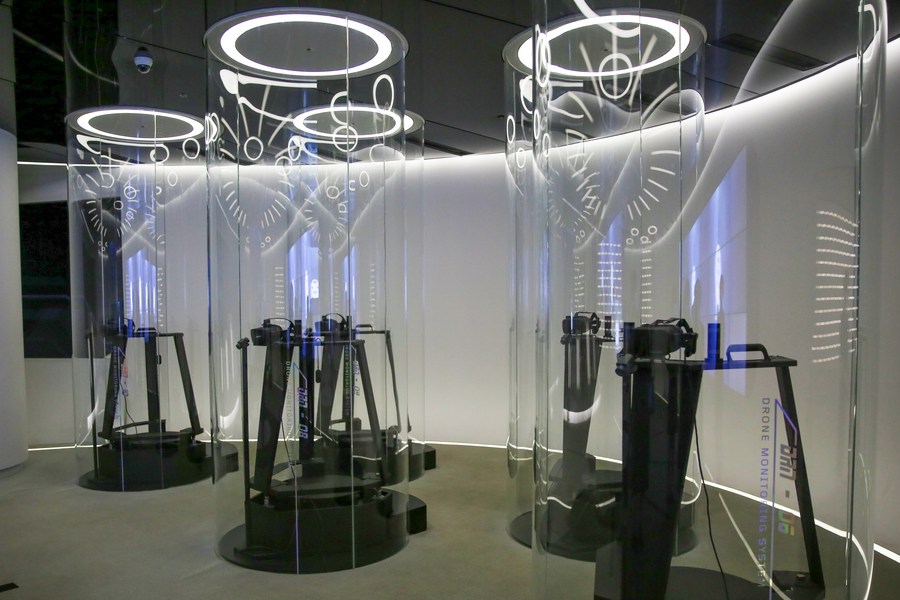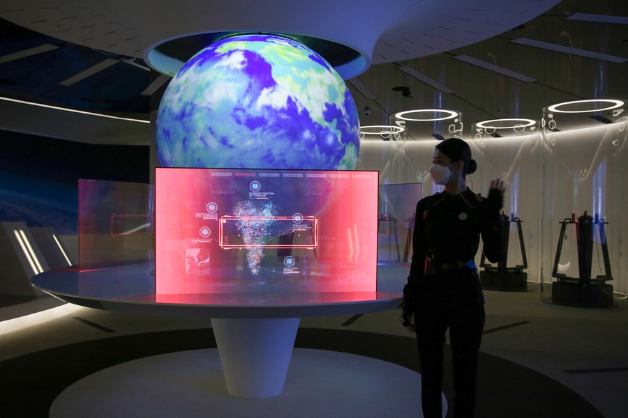 A guide explains a "space control center" which monitors the environment of space and Earth, and ecosystem of the Earth (virtual future scene), at T.um exhibition hall in Seoul, South Korea, July 19, 2022. (Xinhua/Wang Yiliang)