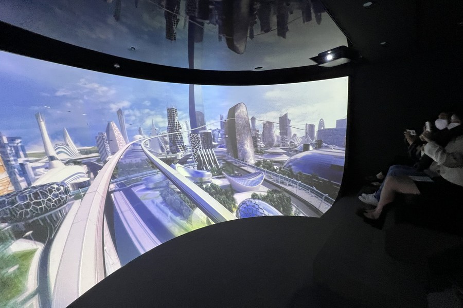 Visitors ride a "flight shuttle" to visit the "future city" at T.um exhibition hall in Seoul, South Korea, July 19, 2022. (Xinhua/Wang Yiliang)■