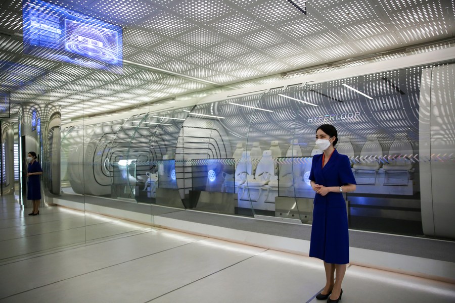 A guide explains the Hyperloop, a proposed high-speed transportation system, at T.um exhibition hall in Seoul, South Korea, July 19, 2022. (Xinhua/Wang Yiliang)