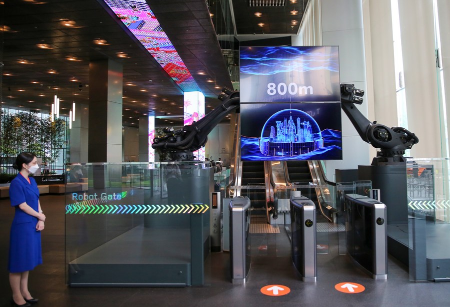Robots display a "future city" through a movable screen at T.um exhibition hall in Seoul, South Korea, July 19, 2022. (Xinhua/Wang Yiliang)