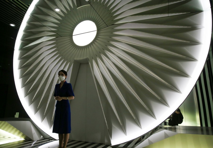 A guide uses facial recognition to unlock the door of a "space shuttle" at T.um exhibition hall in Seoul, South Korea, July 19, 2022. (Xinhua/Wang Yiliang)