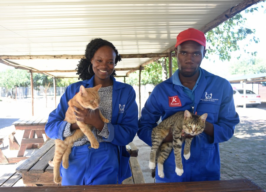 File photo taken on May 25, 2022 shows animal caretakers posing for a photo at the Botswana Society for the Prevention of Cruelty to Animals (BSPCA) in Gaborone, Botswana. (Photo by Tshekiso Tebalo/Xinhua)