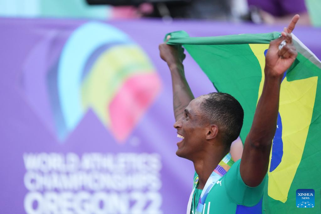Alison Dos Santos of Brazil celebrates after winning the men's 400m hurdles final at the World Athletics Championships Oregon22 in Eugene, Oregon, the United States, July 19, 2022. (Xinhua/Wu Xiaoling)