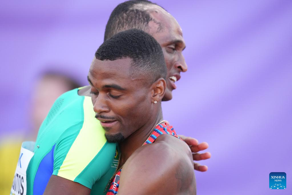 Alison Dos Santos (back) of Brazil receives congratulations after winning the men's 400m hurdles final at the World Athletics Championships Oregon22 in Eugene, Oregon, the United States, July 19, 2022. (Xinhua/Wu Xiaoling)