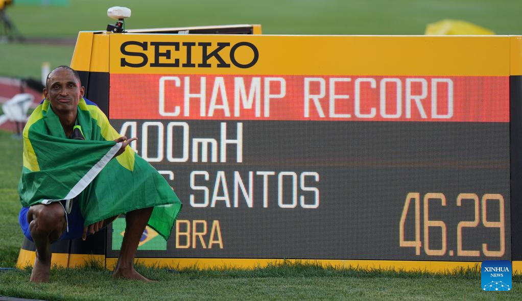 EUGENE, United States, July 19 (Xinhua) -- Brazil's Alison Dos Santos defeated a strong field including Olympic champion Santos Karsten Warholm to win the men's 400m hurdles title at the World Championships here on Tuesday.