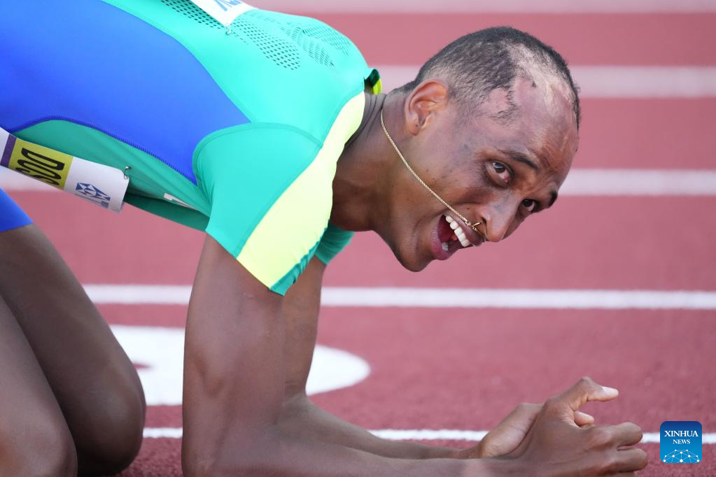 Alison Dos Santos of Brazil reacts after winning the men's 400m hurdles final at the World Athletics Championships Oregon22 in Eugene, Oregon, the United States, July 19, 2022. (Xinhua/Wu Xiaoling)
