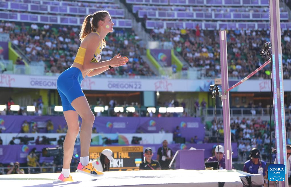 Yaroslava Mahuchikh of Ukraine reacts during the women's high jump final at the World Athletics Championships Oregon22 in Eugene, Oregon, the United States, July 19, 2022. (Xinhua/Wu Xiaoling)