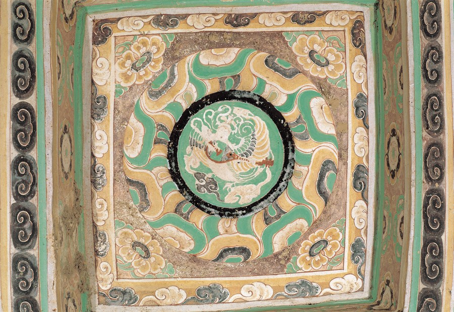 This undated photo provided by the Dunhuang Academy shows the prototype of Jiayao, the official virtual cartoon figure of Mogao Grottoes, with a human upper body, wings, and a bird-like lower body, playing the Chinese musical instrument pipa, on the caisson ceiling of cave No. 360 of Mogao Grottoes in Dunhuang, northwest China's Gansu Province. (Dunhuang Academy/Handout via Xinhua)