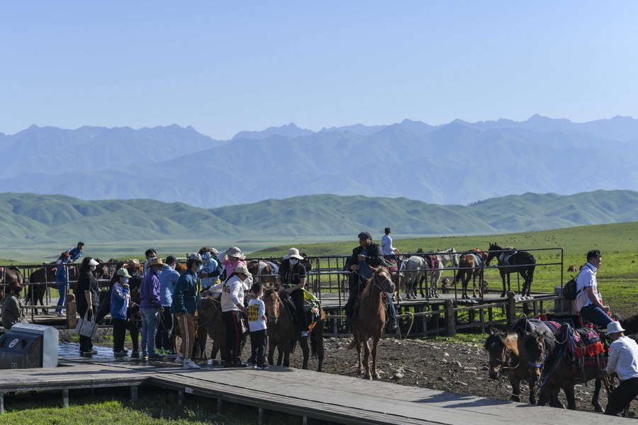 Local residents arrange horseback riding service for tourists at the Narat scenic spot in Xinyuan County, northwest China's Xinjiang Uygur Autonomous Region, June 30, 2022. (Xinhua/Zhao Ge)