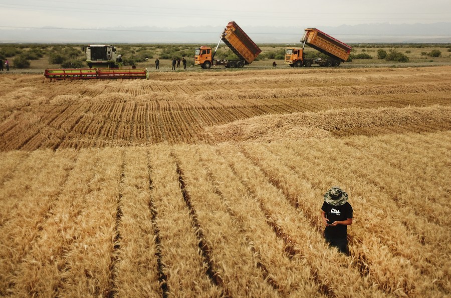 Aerial photo taken on July 7, 2022 shows a farmer checking the wheat in a field before harvesting in Qitai County, Changji Hui Autonomous Prefecture, northwest China's Xinjiang Uygur Autonomous Region. (Xinhua/Zhang Xiaocheng)
