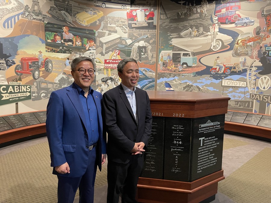 Lu Weiding (L), CEO of Wanxiang Group, and Ni Pin, president of Wanxiang America Corporation, are seen in the Hall of Honor at the U.S. Automotive Hall of Fame in Detroit, the United States, on July 20, 2022. (Xinhua/Zhang Mocheng)
