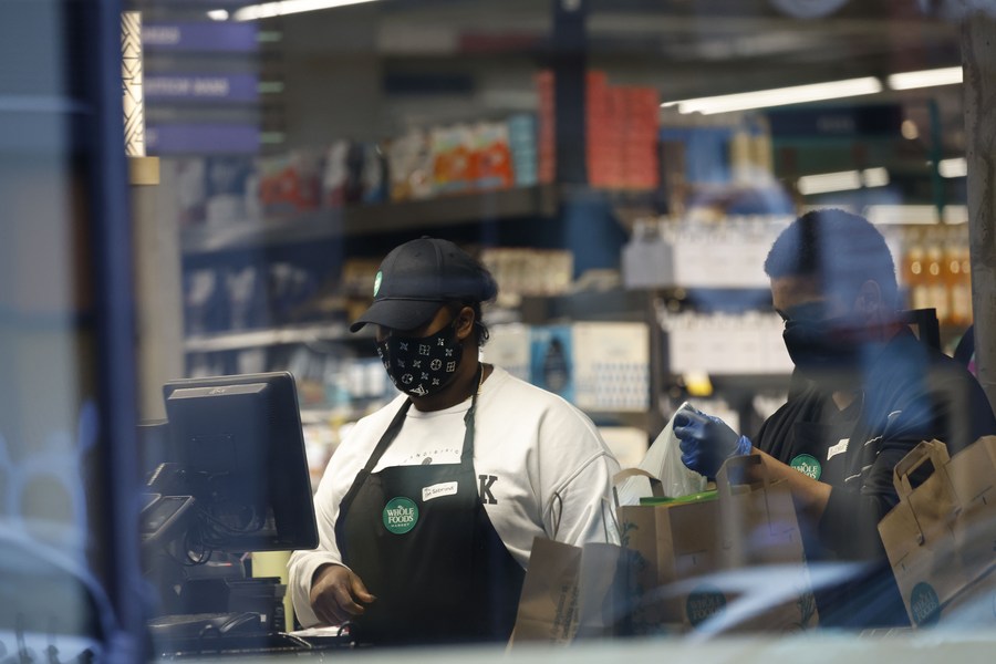 Workers are seen in a food market in Washington, D.C., the United States, on May 6, 2022. (Photo by Ting Shen/Xinhua)