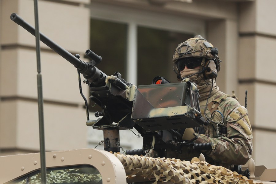 A soldier takes part in a parade during the Belgian National Day celebrations in Brussels, Belgium, on July 21, 2022. (Xinhua/Zheng Huansong)