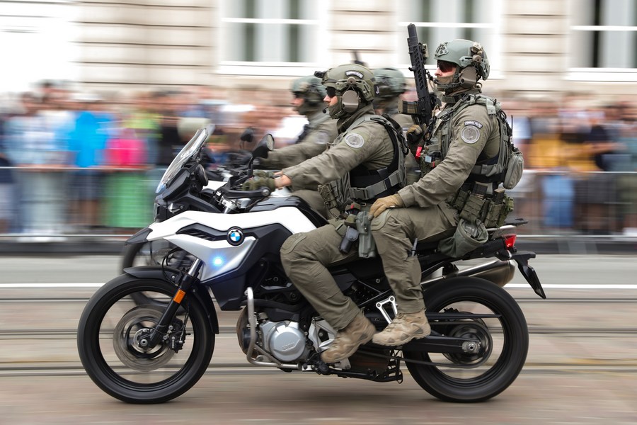 Federal police take part in a parade during the Belgian National Day celebrations in Brussels, Belgium, on July 21, 2022. (Xinhua/Zheng Huansong)