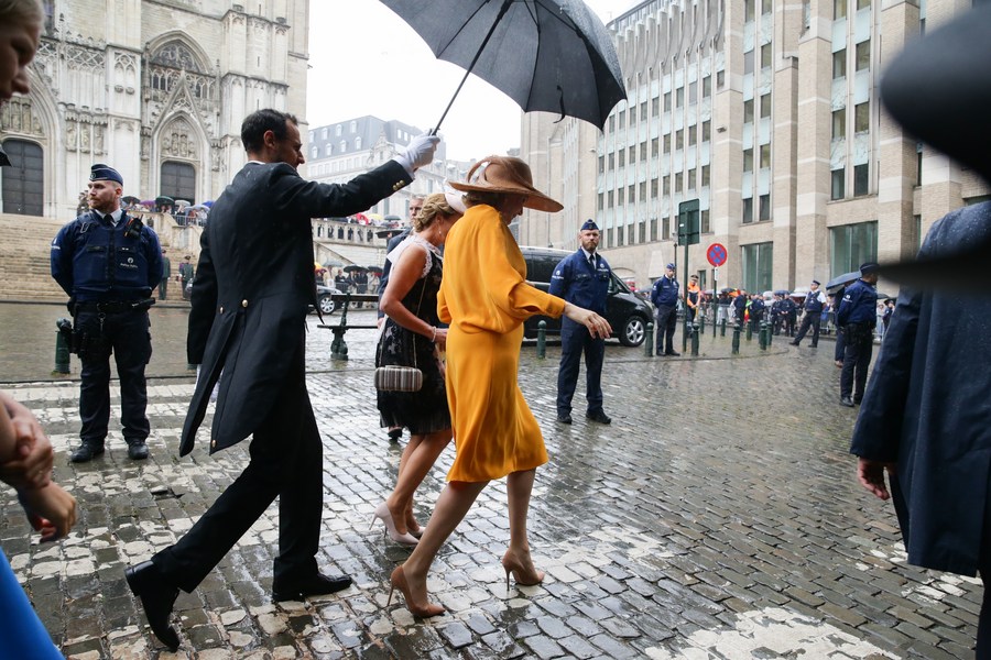 Queen Mathilde of Belgium walks in the rain during an event of Belgian National Day celebrations in Brussels, Belgium, July 21, 2022. (Xinhua/Zheng Huansong)