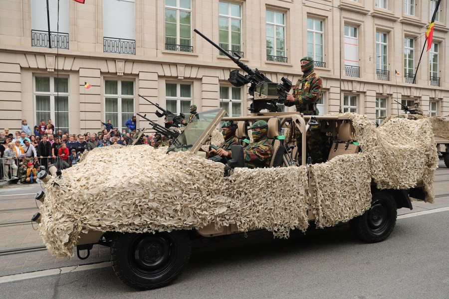 Soldiers on Fox Rapid Reaction Vehicles take part in a parade during the Belgian National Day celebrations in Brussels, Belgium, on July 21, 2022. (Xinhua/Zheng Huansong)