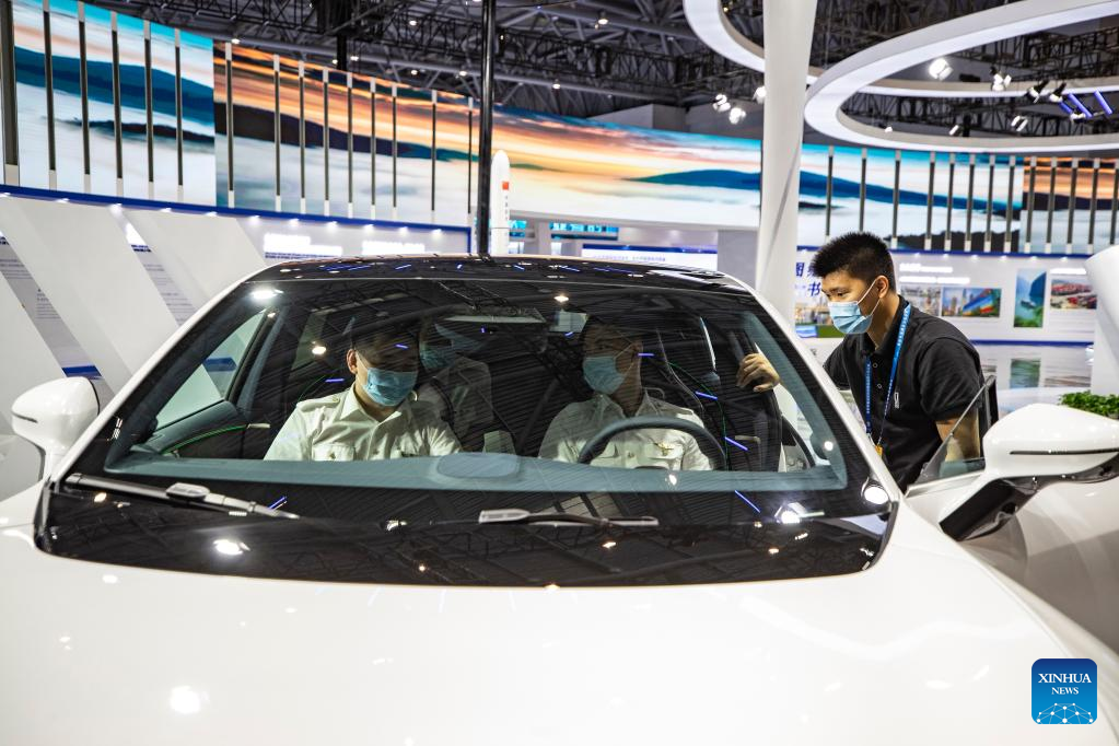 Visitors learn about a new-energy car displayed at the fourth Western China International Fair for Investment and Trade in southwest China's Chongqing, July 22, 2022. The fourth Western China International Fair for Investment and Trade (WCIFIT) kicked off Thursday in southwest China's Chongqing Municipality. The event serves to promote the image of western China while encouraging international cooperation. (Xinhua/Huang Wei)