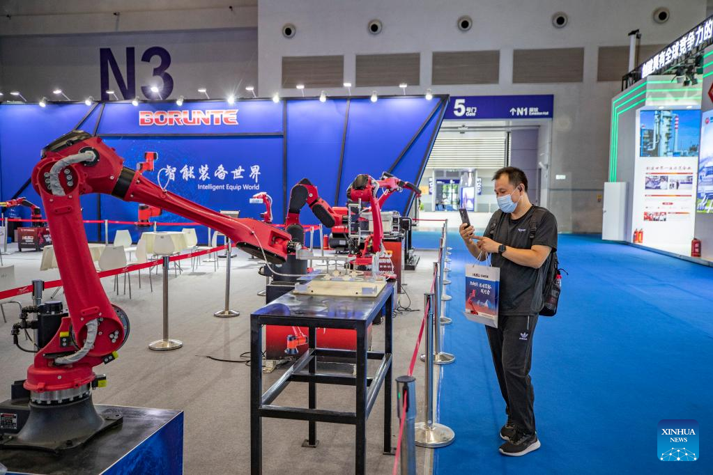 A visitor takes pictures of equipment displayed at the fourth Western China International Fair for Investment and Trade in southwest China's Chongqing, July 22, 2022. The fourth Western China International Fair for Investment and Trade (WCIFIT) kicked off Thursday in southwest China's Chongqing Municipality. The event serves to promote the image of western China while encouraging international cooperation. (Xinhua/Huang Wei)