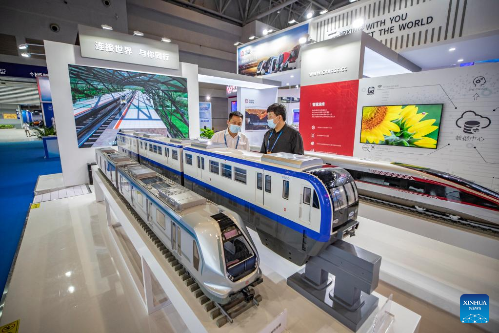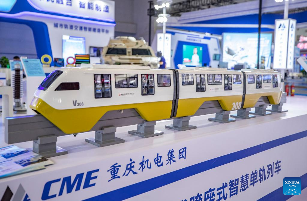 Photo taken on July 22, 2022 shows the model of a smart monorail train displayed at the fourth Western China International Fair for Investment and Trade in southwest China's Chongqing. The fourth Western China International Fair for Investment and Trade (WCIFIT) kicked off Thursday in southwest China's Chongqing Municipality. The event serves to promote the image of western China while encouraging international cooperation. (Xinhua/Huang Wei)