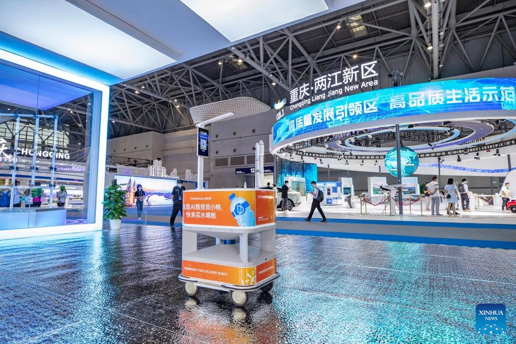 Photo taken on July 22, 2022 shows a delivery robot at an exhibition hall of the fourth Western China International Fair for Investment and Trade in southwest China's Chongqing. The fourth Western China International Fair for Investment and Trade (WCIFIT) kicked off Thursday in southwest China's Chongqing Municipality. The event serves to promote the image of western China while encouraging international cooperation. (Xinhua/Huang Wei)