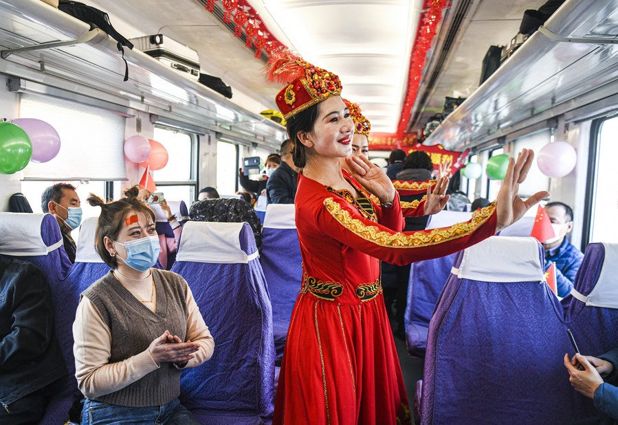 Staff members and passengers dance together in a passenger car of train No. K9756 from Korla to Yetimbulak in northwest China's Xinjiang Uygur Autonomous Region, Dec. 9, 2020. (Xinhua/Wang Fei)