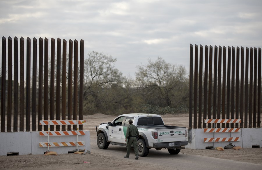 A U.S. Border Patrol agent walks to his vehicle while patrolling near a newly-built section of the border wall between Mexico and the United States near Eagle Pass, Texas, the United States, Jan. 7, 2022. (Photo by Nick Wagner/Xinhua)