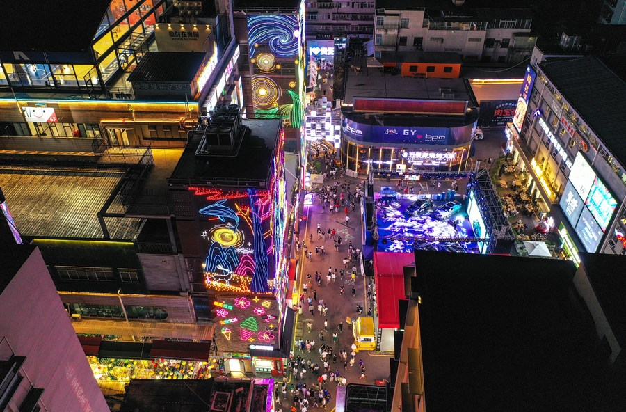 In this aerial photo, people tour a local market at the Qingyun Road in Nanming District of Guiyang, capital city of southwest China's Guizhou Province, July 22, 2022. (Xinhua/Yang Wenbin)