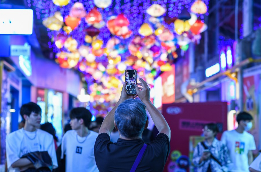 A visitor takes photos of a local market at the Qingyun Road in Nanming District of Guiyang, capital city of southwest China's Guizhou Province, July 21, 2022. (Xinhua/Yang Wenbin)■