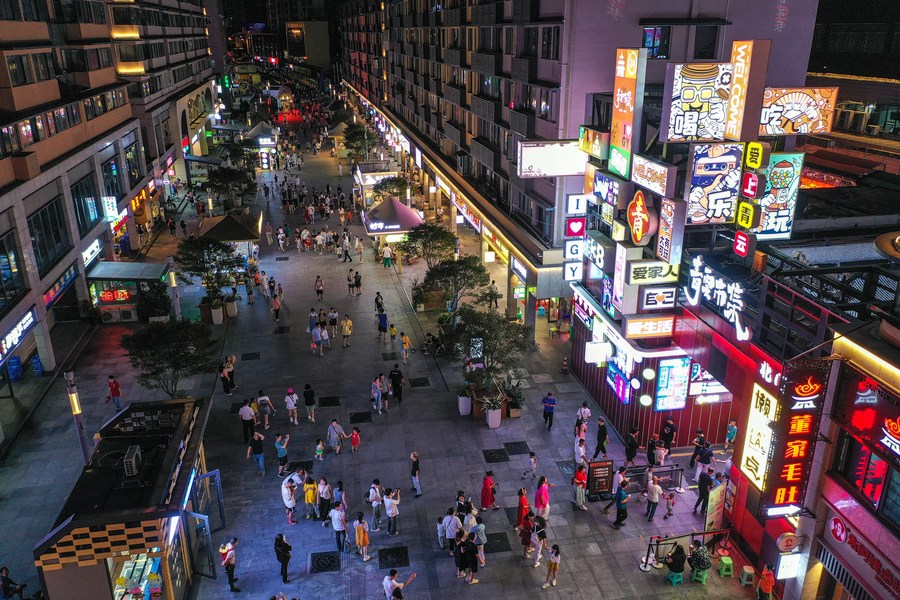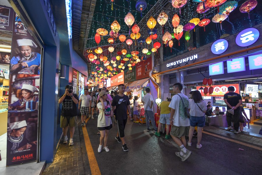 People tour a local market at the Qingyun Road in Nanming District of Guiyang, capital city of southwest China's Guizhou Province, July 21, 2022. (Xinhua/Yang Wenbin)
