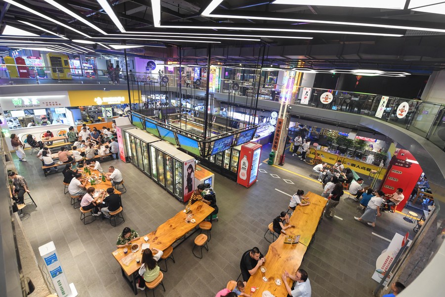 People have meals at a local market at the Qingyun Road in Nanming District of Guiyang, capital city of southwest China's Guizhou Province, July 21, 2022. (Xinhua/Yang Wenbin)