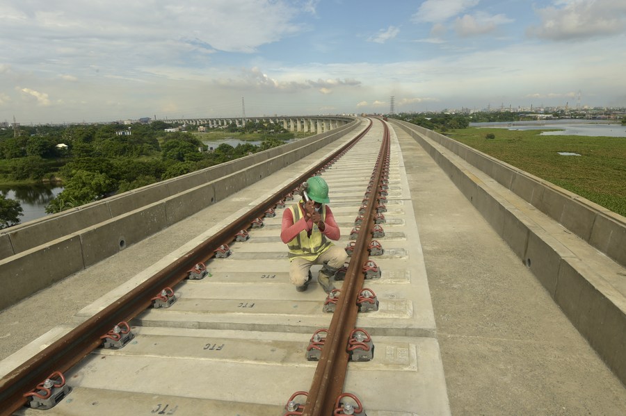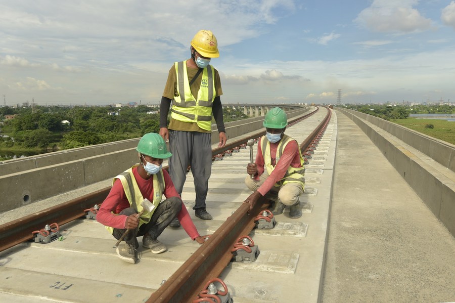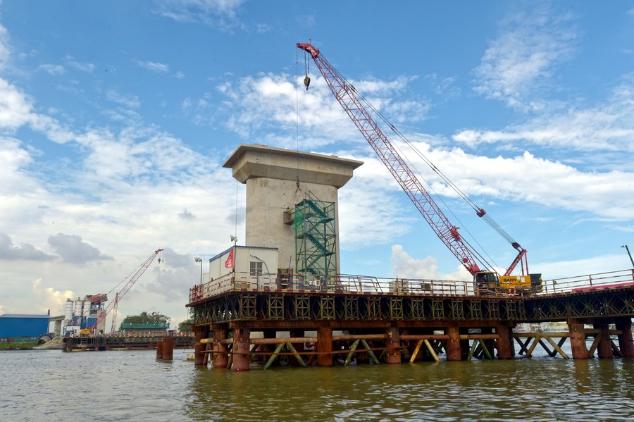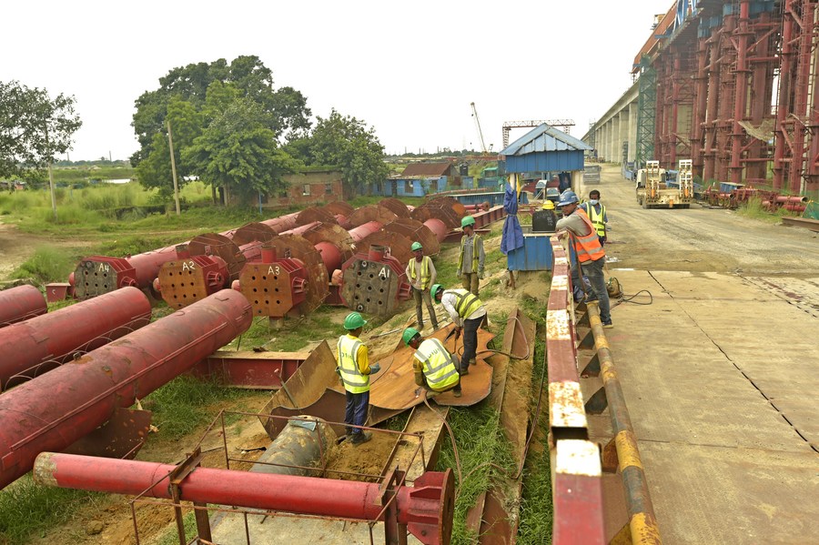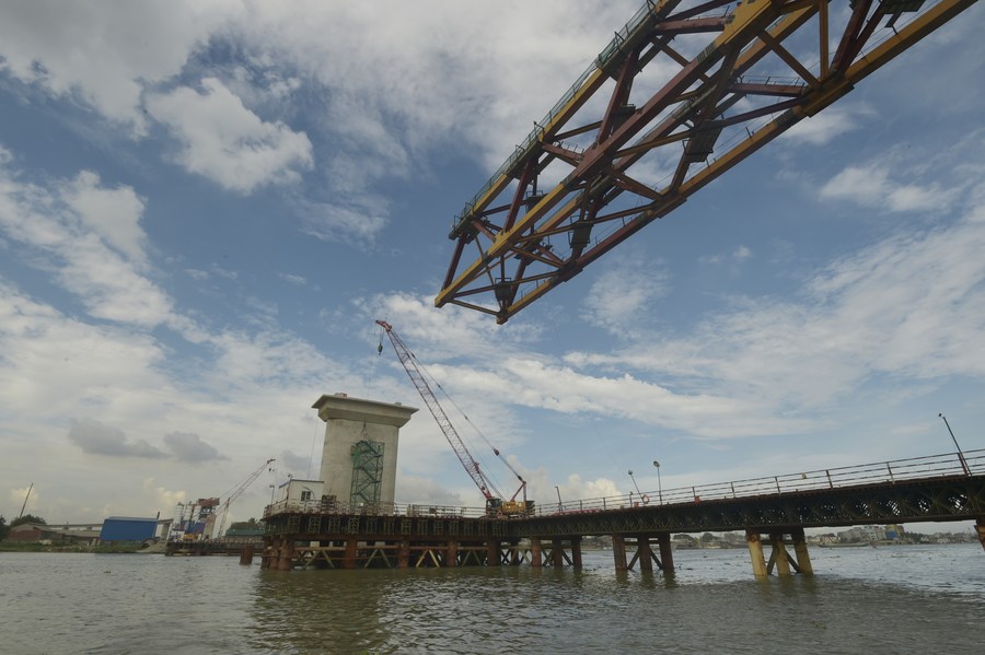 Workers operate at a construction site of Padma Bridge Rail Link Project in Keraniganj on the outskirts of Dhaka, Bangladesh, July 5, 2022. (Xinhua)