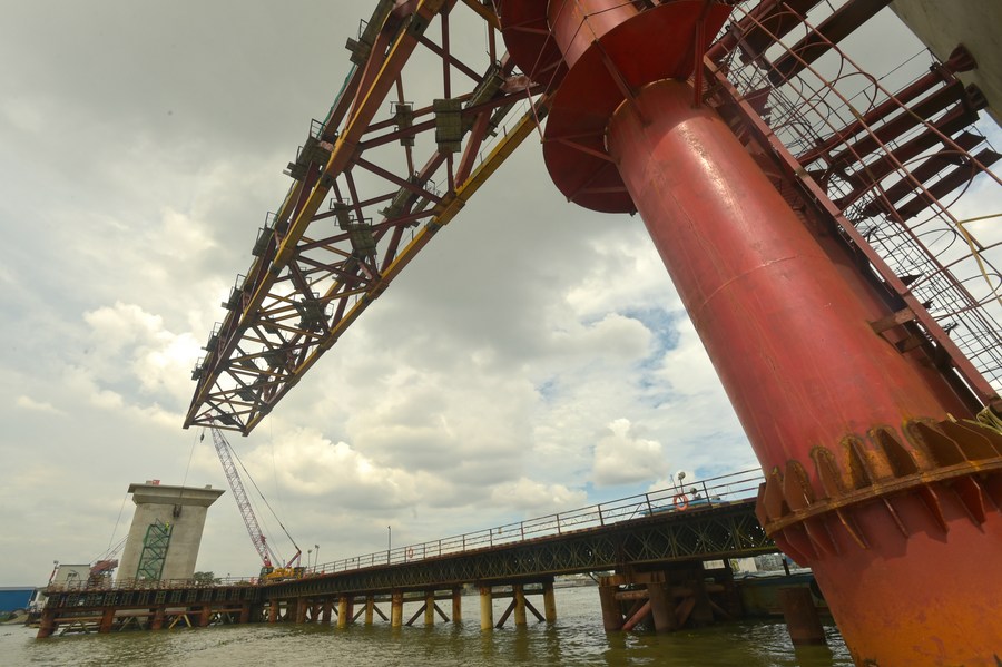Photo taken on July 5, 2022 shows a construction site of Padma Bridge Rail Link Project in Keraniganj on the outskirts of Dhaka, Bangladesh. (Xinhua)