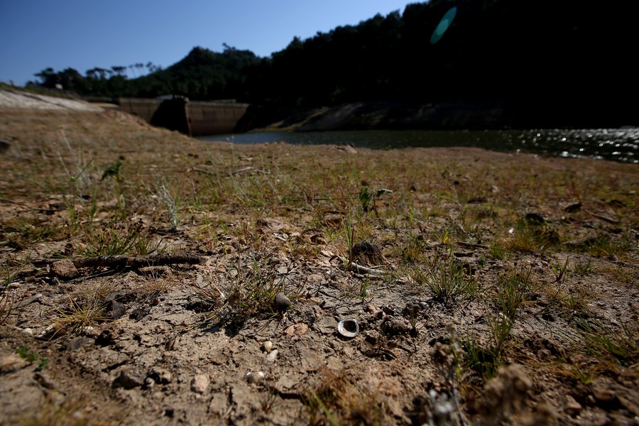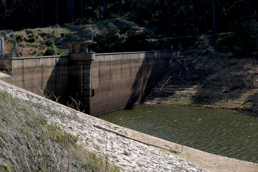 Photo taken on July 9, 2022 shows the low water level of the Rio da Mula dam in Cascais, Portugal. (Photo by Pedro Fiuza/Xinhua)