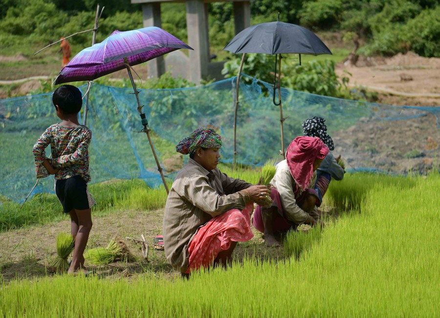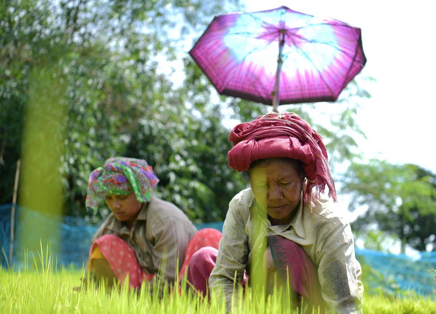 Farmers work in a paddy field on the outskirts of Agartala, the capital city of India's northeastern state of Tripura, July 23, 2022. (Str/Xinhua)