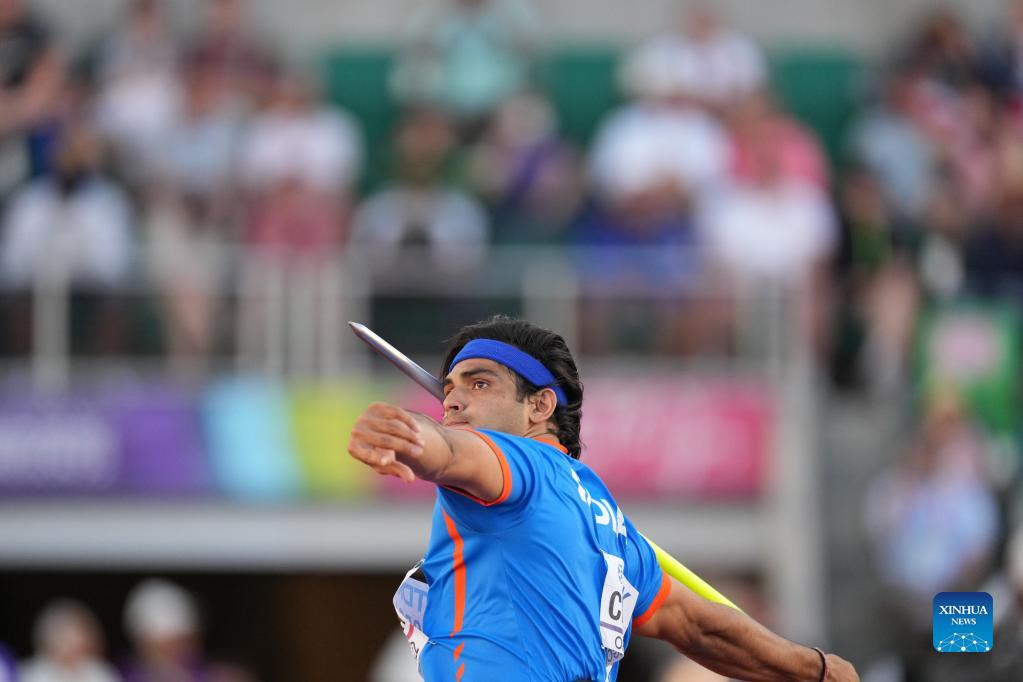 Neeraj Chopra of India competes during the men's javalin throw final at the World Athletics Championships Oregon22 in Eugene, Oregon, the United States, July 23, 2022. (Xinhua/Wu Xiaoling)