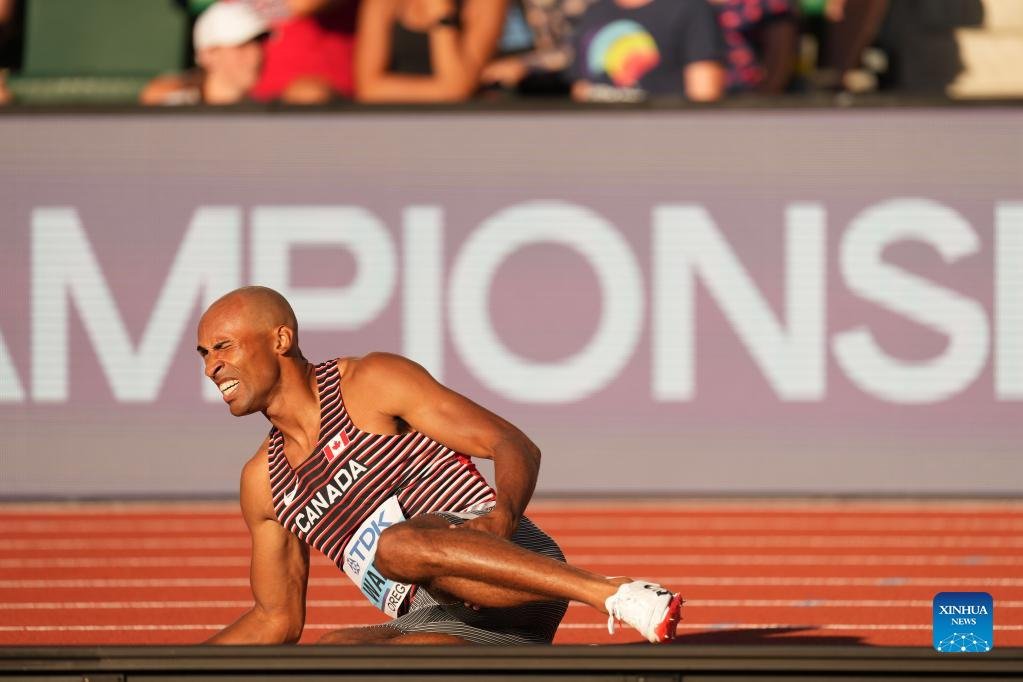 Canada's Damian Warner reacts after sustaining an injury during the 400m race of the Decathlon event at the World Athletics Championships Oregon22 in Eugene, Oregon, the United States, July 23, 2022. (Xinhua/Wu Xiaoling)