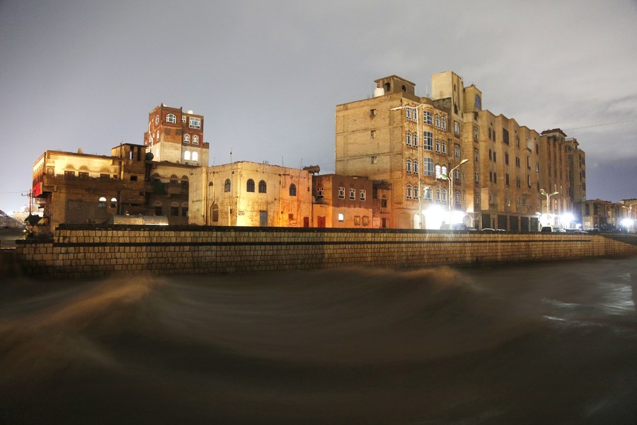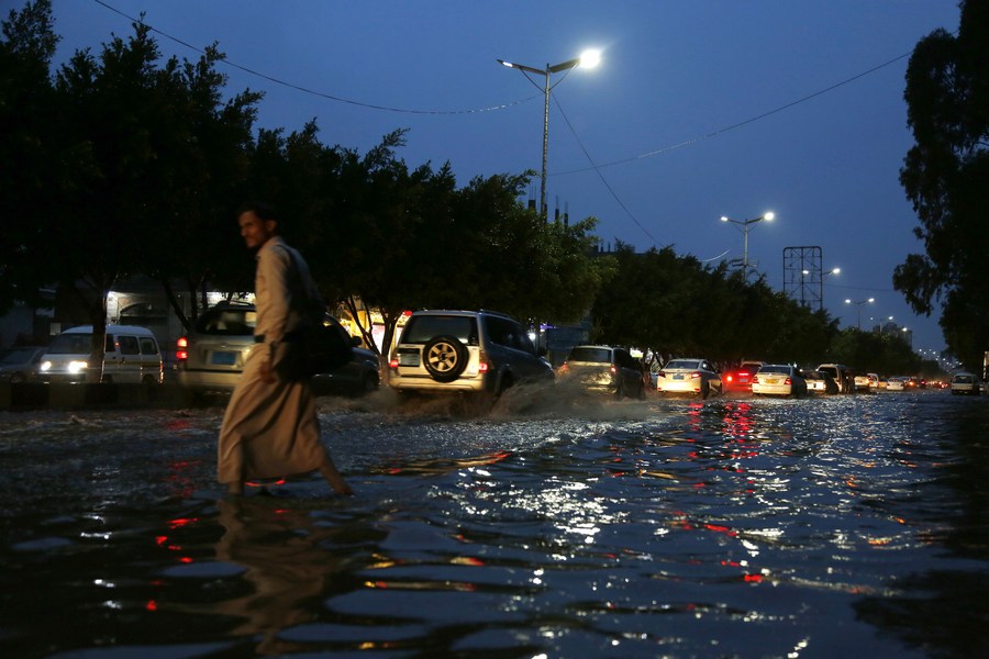 Photo taken on July 23, 2022 shows a flooded street after heavy rain in Sanaa, Yemen. (Photo by Mohammed Mohammed/Xinhua)■