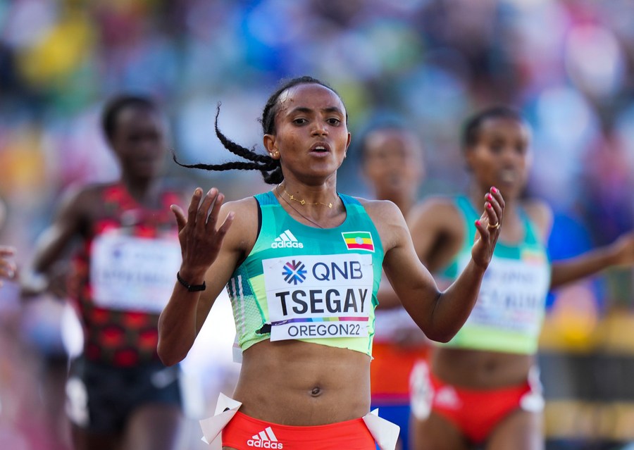 Ethiopia's Gudaf Tsegay celebrates after winning the women's 5000m final at the World Athletics Championships Oregon22 in Eugene, Oregon, the United States, July 23, 2022. (Xinhua/Wang Ying)
