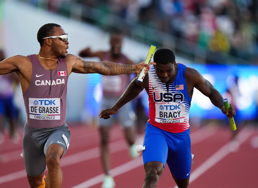 Andre De Grasse (L) of team Canada sprints with Marvin Bracy of team USA during the men's 4X100m relay final at the World Athletics Championships Oregon22 in Eugene, Oregon, the United States, July 23, 2022. (Xinhua/Wang Ying)