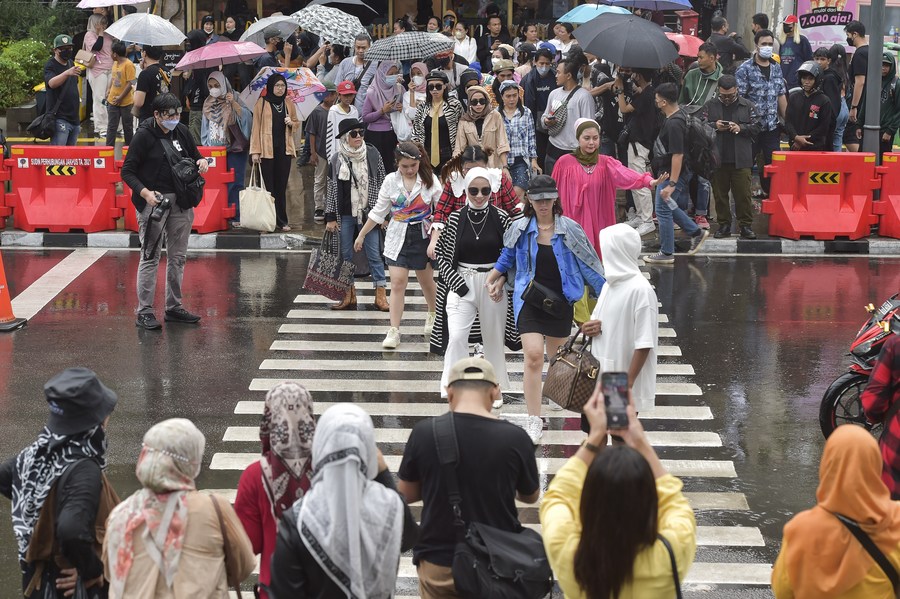 People walk on a zebra crossing like catwalk models at the Dukuh Atas area in Jakarta, Indonesia, July 23, 2022. (Xinhua/Veri Sanovri)