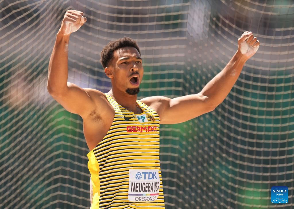 Leo Neugebauer of Germany reacts during the discus throw of the Decathlon event at the World Athletics Championships Oregon22 in Eugene, Oregon, the United States, July 24, 2022. (Xinhua/Wu Xiaoling)