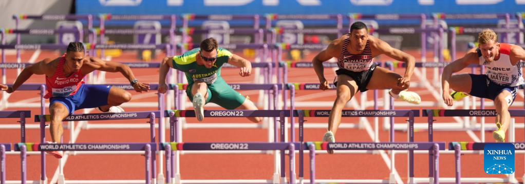 Ayden Owens-Delerme of Puerto Rico, Daniel Golubovic of Australia, Pierce Lepage of Canada and Kevin Mayer of France (L to R) compete during the 110m hurdles of the Decathlon event at the World Athletics Championships Oregon22 in Eugene, Oregon, the United States, July 24, 2022. (Xinhua/Wu Xiaoling)