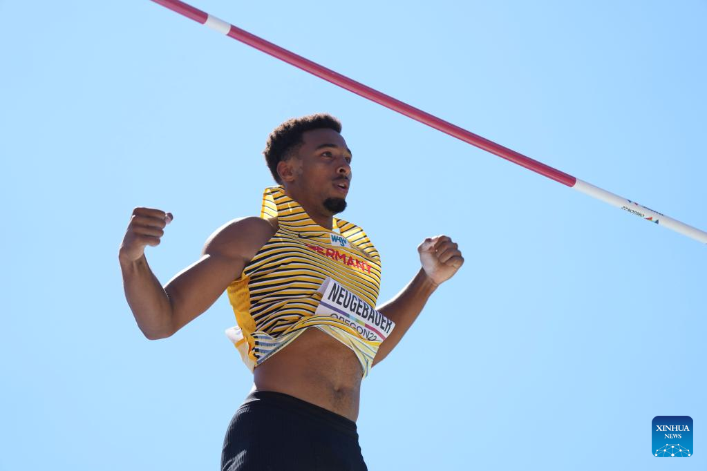 Leo Neugebauer of Germany competes during the pole vault of the Decathlon event at the World Athletics Championships Oregon22 in Eugene, Oregon, the United States, July 24, 2022. (Xinhua/Wu Xiaoling)