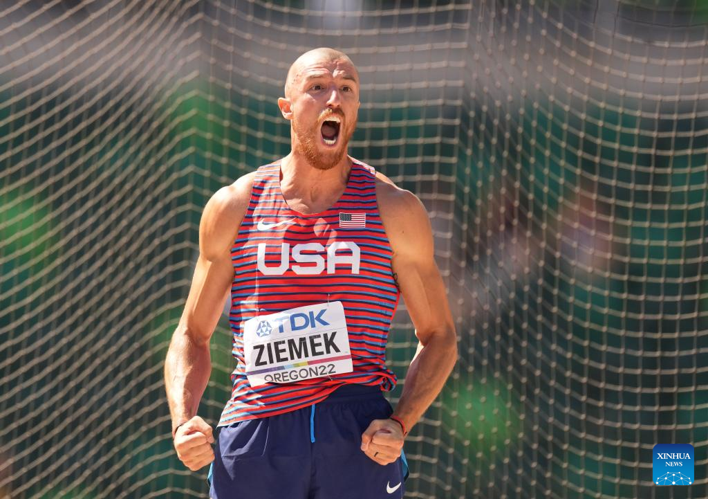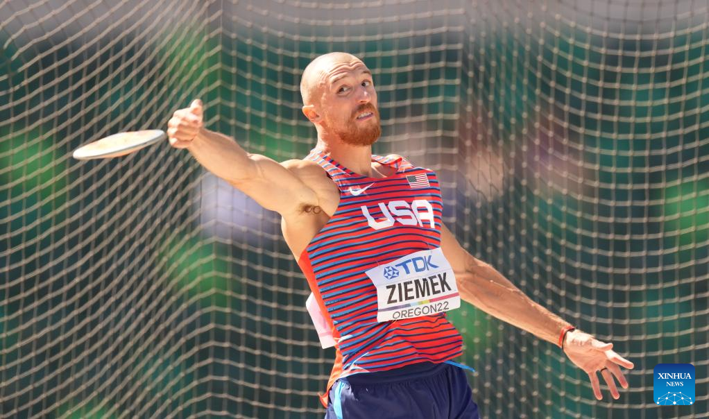 Zachery Ziemek of the United States competes during the discus throw of the Decathlon event at the World Athletics Championships Oregon22 in Eugene, Oregon, the United States, July 24, 2022. (Xinhua/Wu Xiaoling)